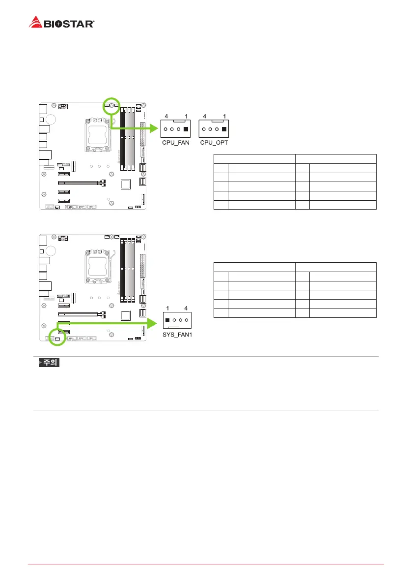 CPU_FAN, CPU_OPT, SYS_FAN1 은4-pin과3-pin 헤드 커넥터를 지원합니다. 커넥터에 전선을