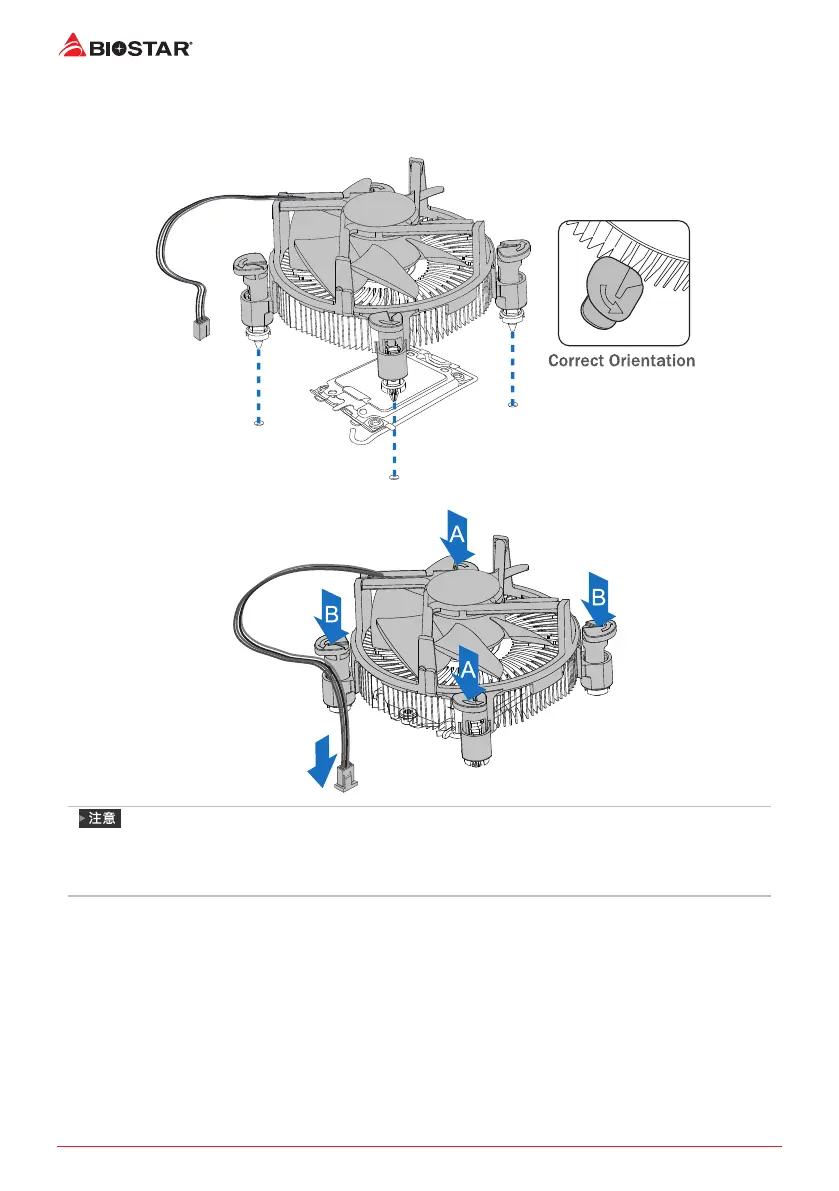步驟2: 依序把對角2個固定件同時向下按壓,以固定風扇,完成CPU安裝。