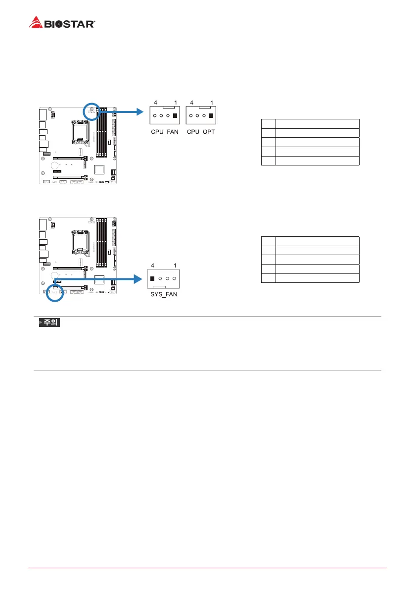 CPU_FAN, CPU_OPT, SYS_FAN은4-pin과3-pin 헤드 커넥터를 지원합니다. 커넥터에 전선을
