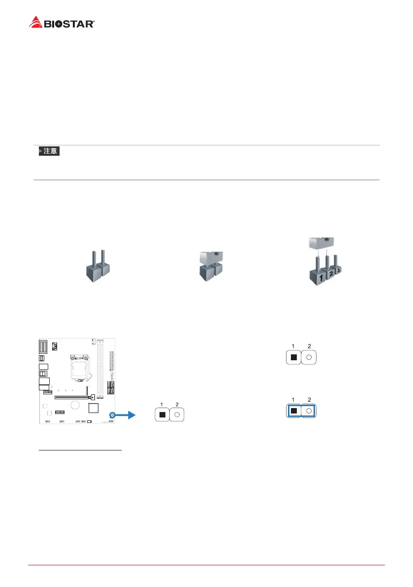 放置在針腳上時,則跳線為打開(open)狀態。下圖顯示如何設置跳線。