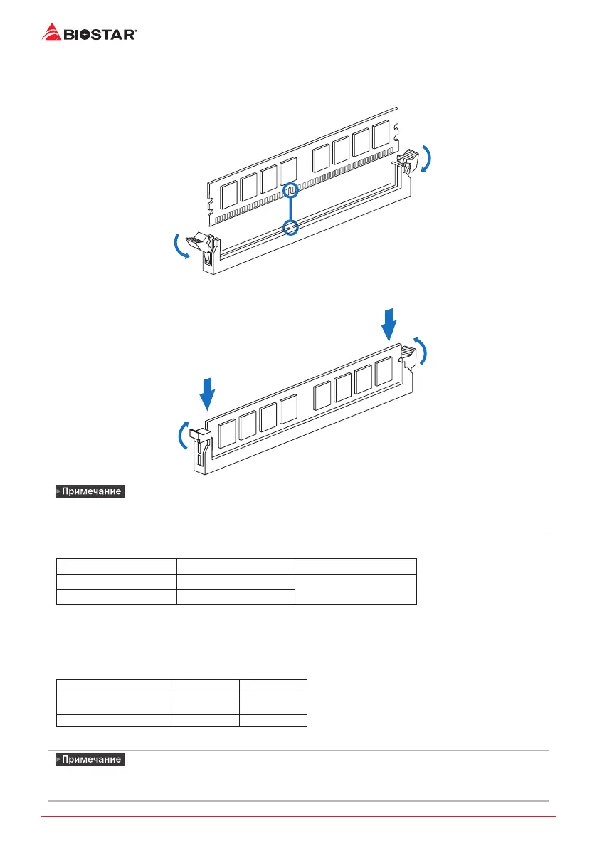 Устанавливайте модули памяти одинаковой плотности попарно, как показано в таблице.