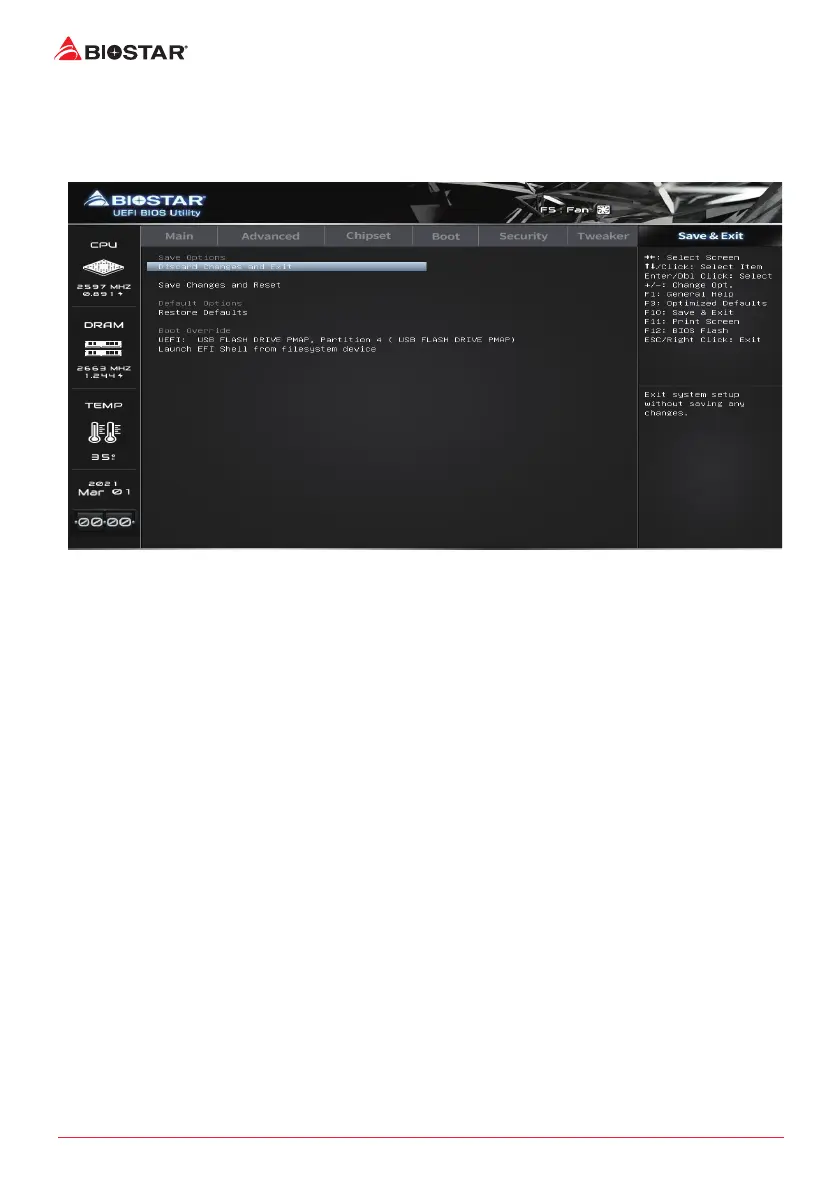 This menu allows you to load the opmal default sengs, and save or discard the changes to the