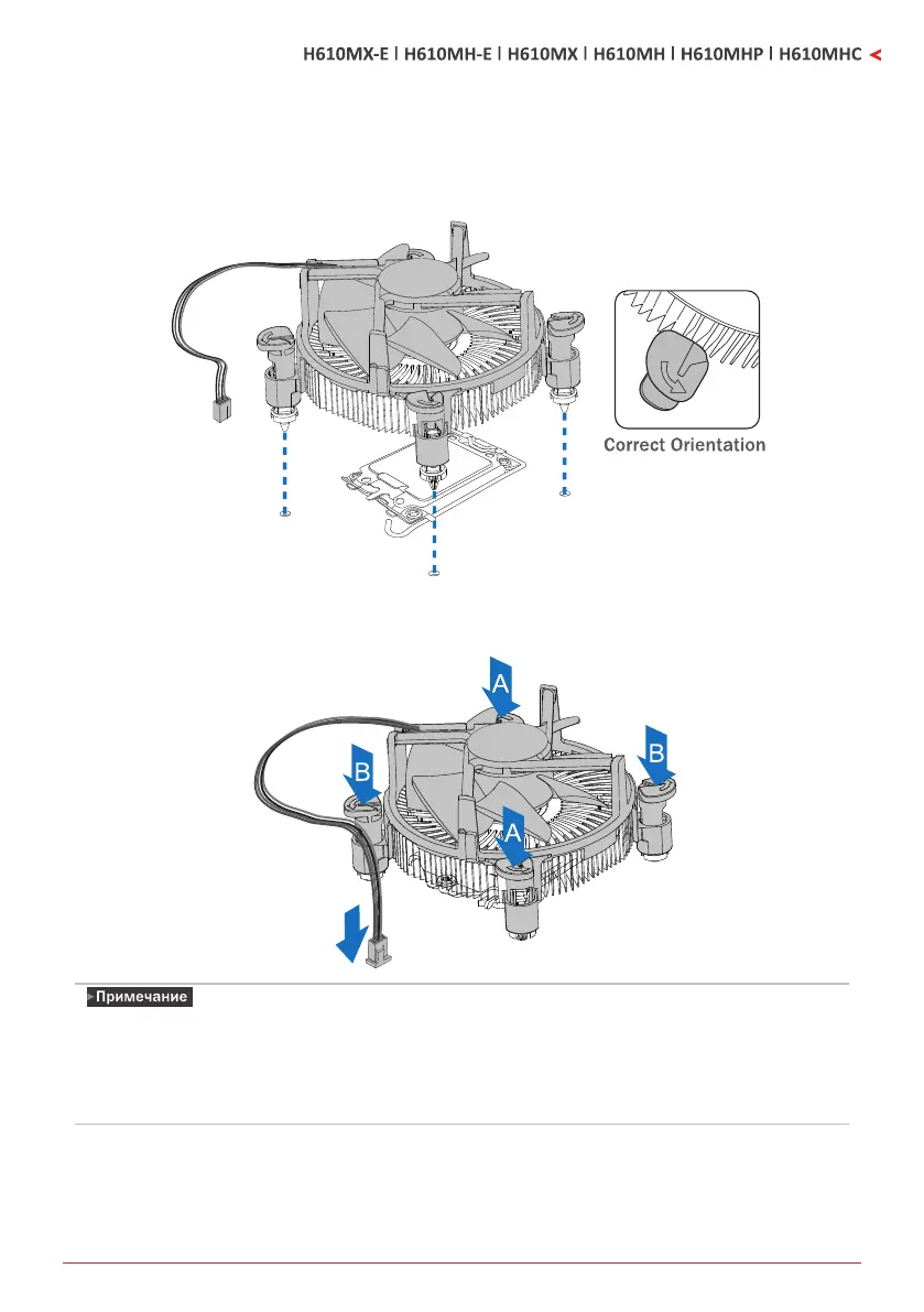по диагонали, чтобы зафиксировать вентилятор ЦП в сборе. При фиксации каждого