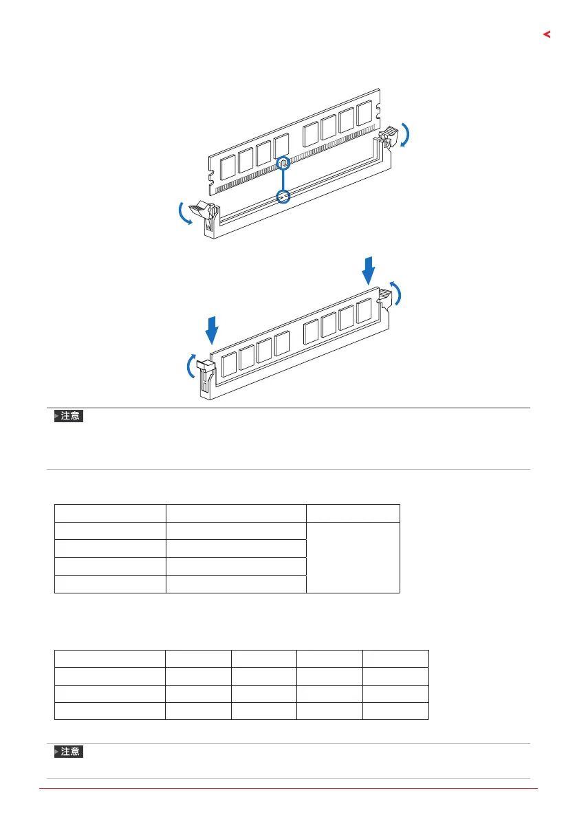安裝雙通道記憶體時,請先將記憶體插入DIMMA1和DIMMB1插槽裡。 如果未正確插入記憶