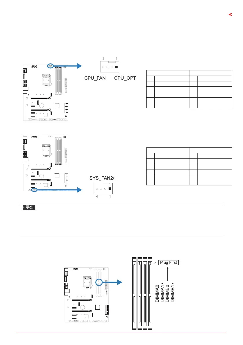 » CPU_FAN, CPU_OPT, SYS_FAN1/2 은4-pin과3-pin 헤드 커넥터를 지원합니다. 커넥터에