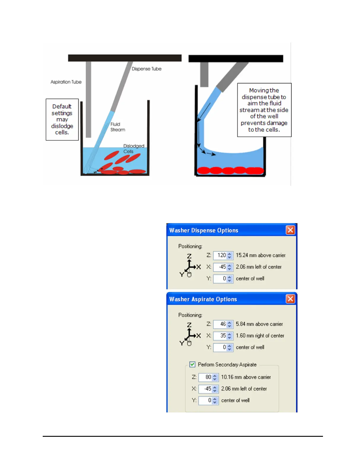 Repositioning the dispense and aspirate tubes helps minimize turbulence in the