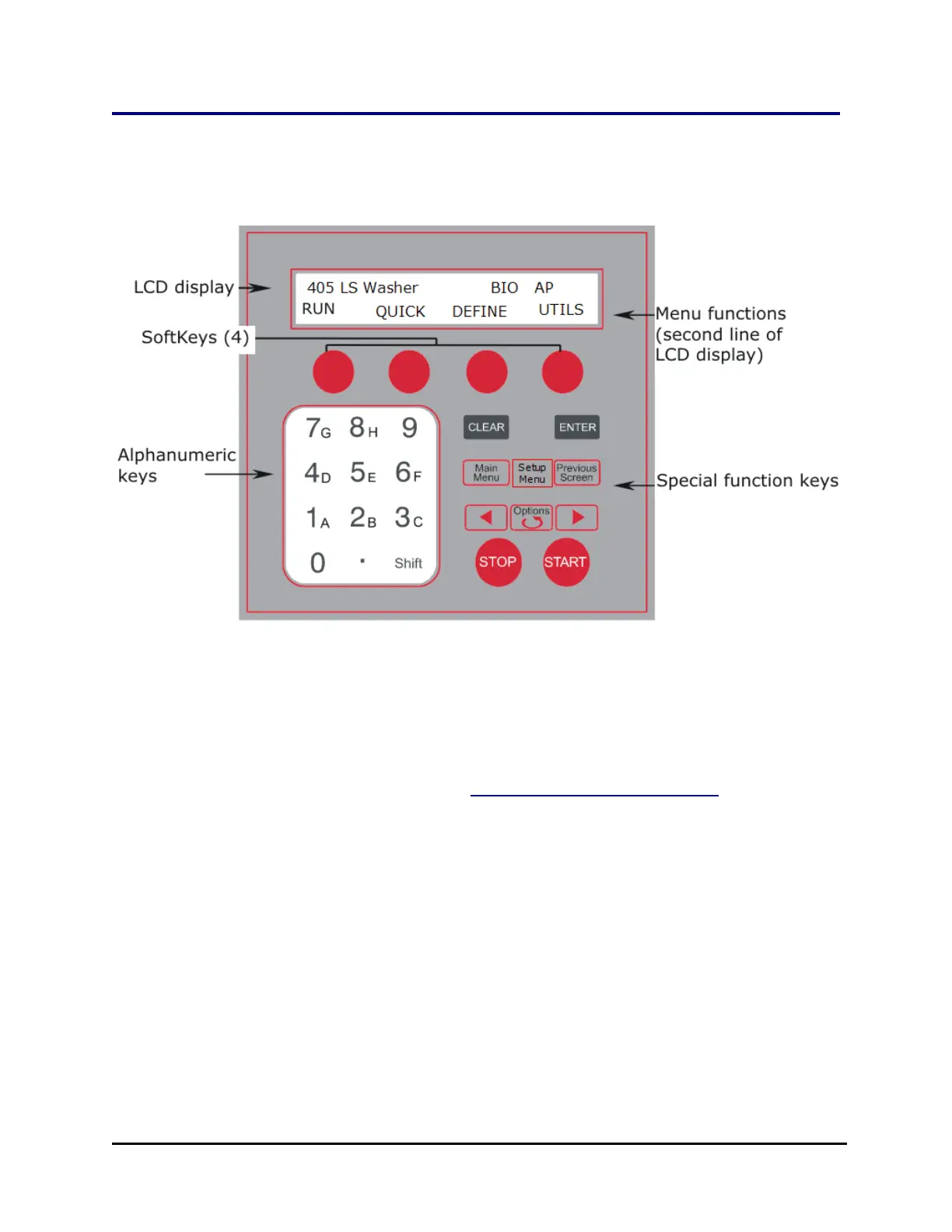 The keypad on the 405™ Microplate Washer LS features 26-keys and a 2 x 24-