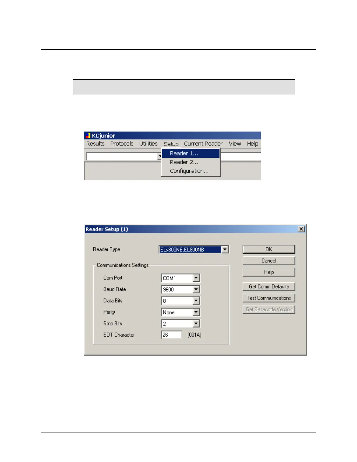 2. At KCjunior’s main screen, choose Setup|Reader 1 (or Reader 2).