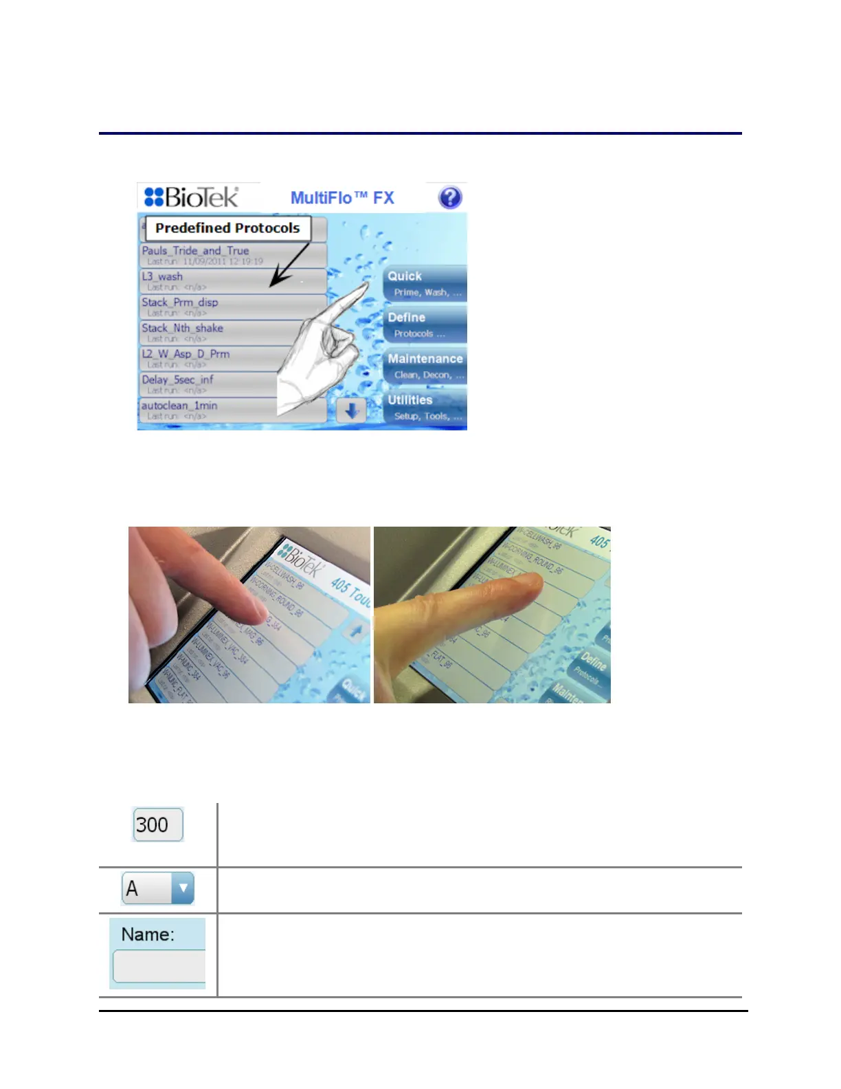 l Wash/Dispense Protocols: Touch a protocol on the Home screen to run it. All