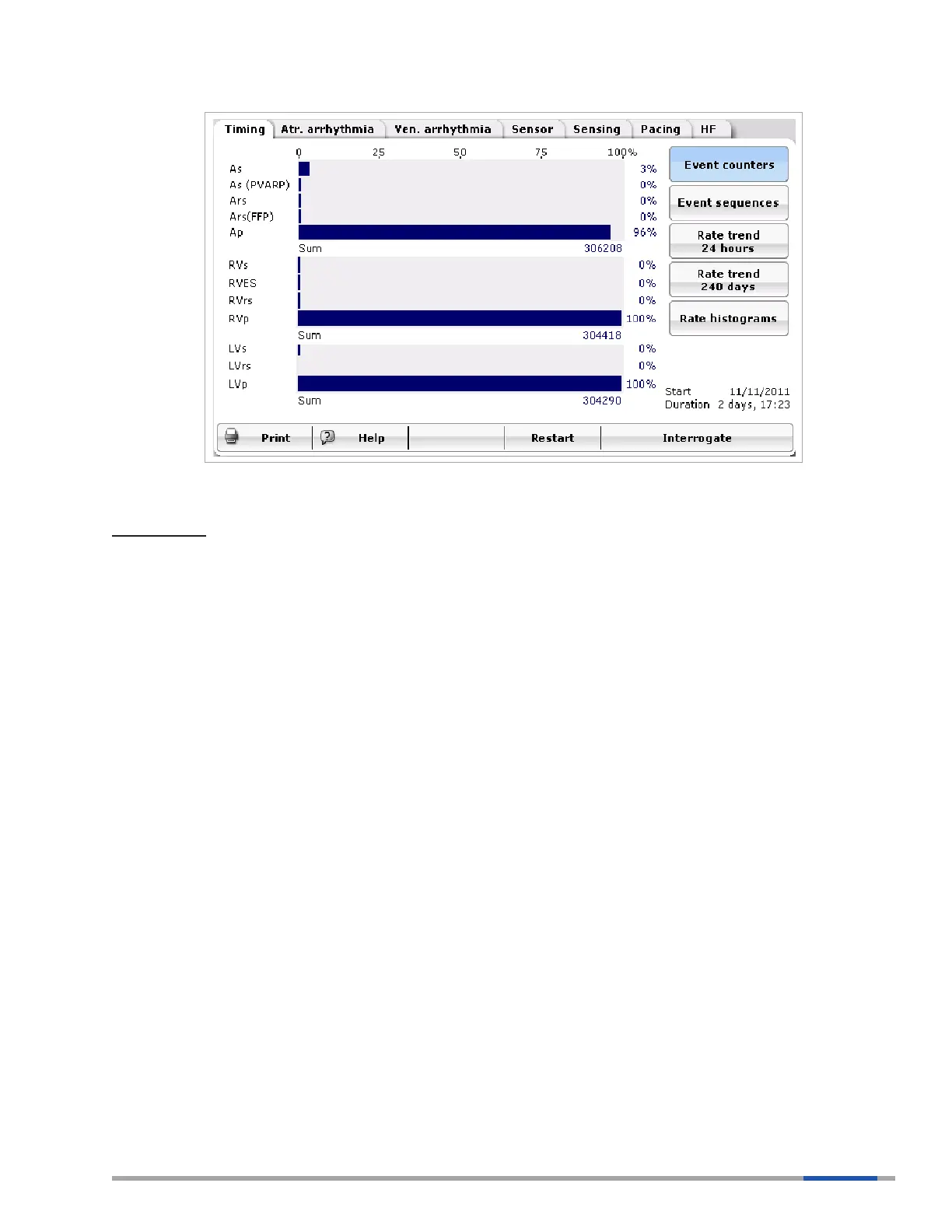 Event sequences, shown in Figure 36, provide the percentage of each state of pacing in the