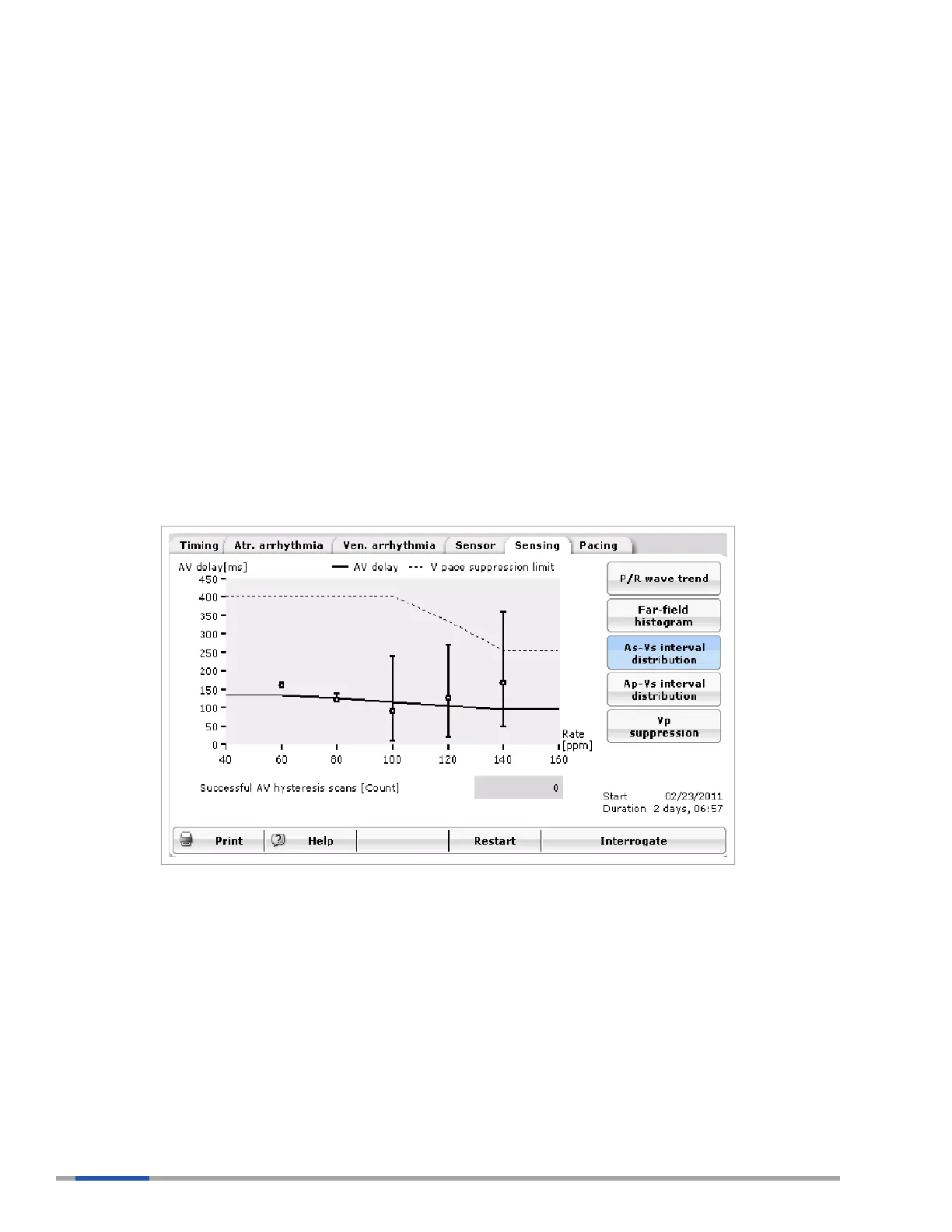 As-Vs interval is displayed for various rate ranges, labeled by the average heart rate. The programmed