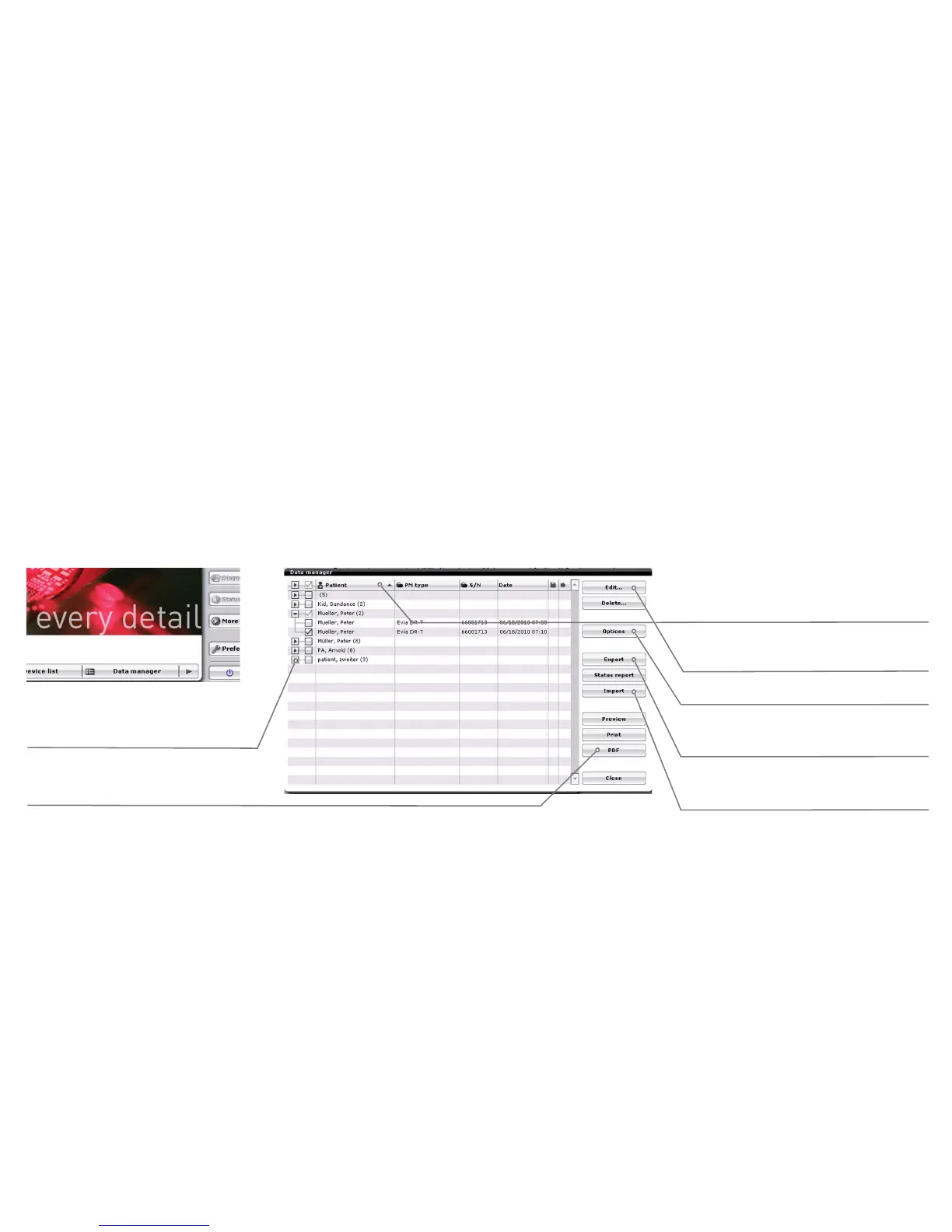 Select the [Data manager] button on the start screen. All stored follow-up data can be viewed, printed, exported and sorted according to the displayed