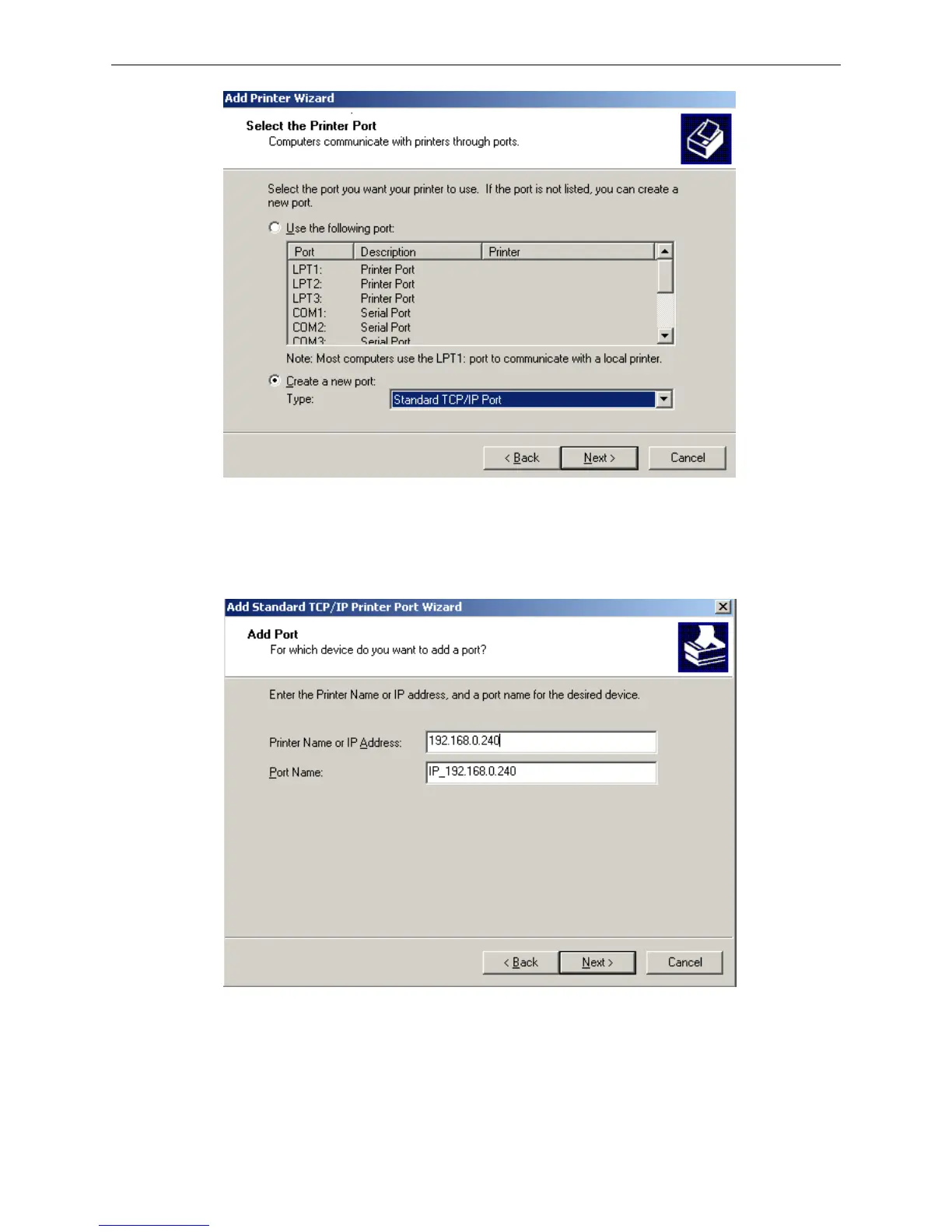 5) A window of “Add Port” pops up, enter the IP address reported by the “Setting printer’s IP address”