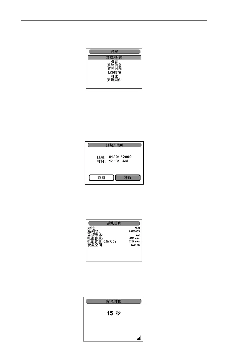 BIRD 5000-XT - 设置菜单; 日期; 时间; 系统信息; 背光超时