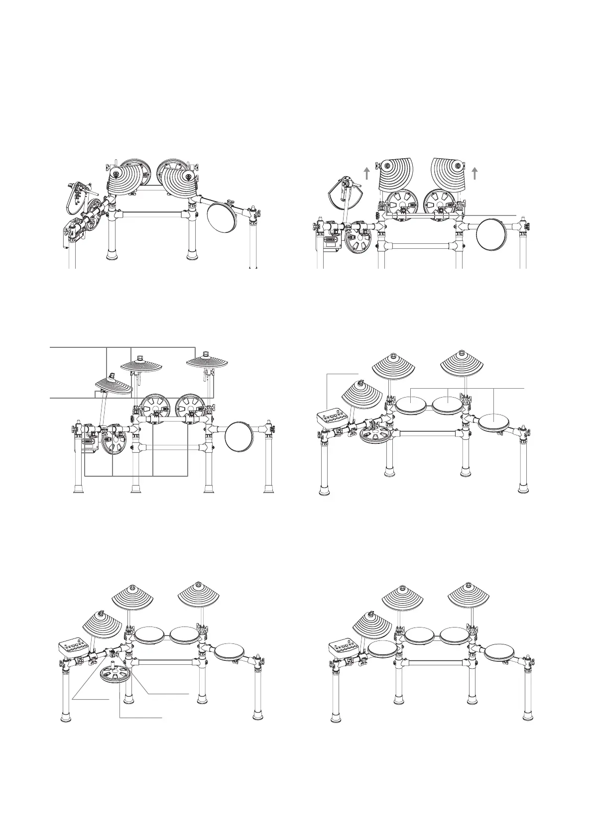 6. Loosen the wing nut E and pull up cymbal stands F, then tighten the wing nuts E