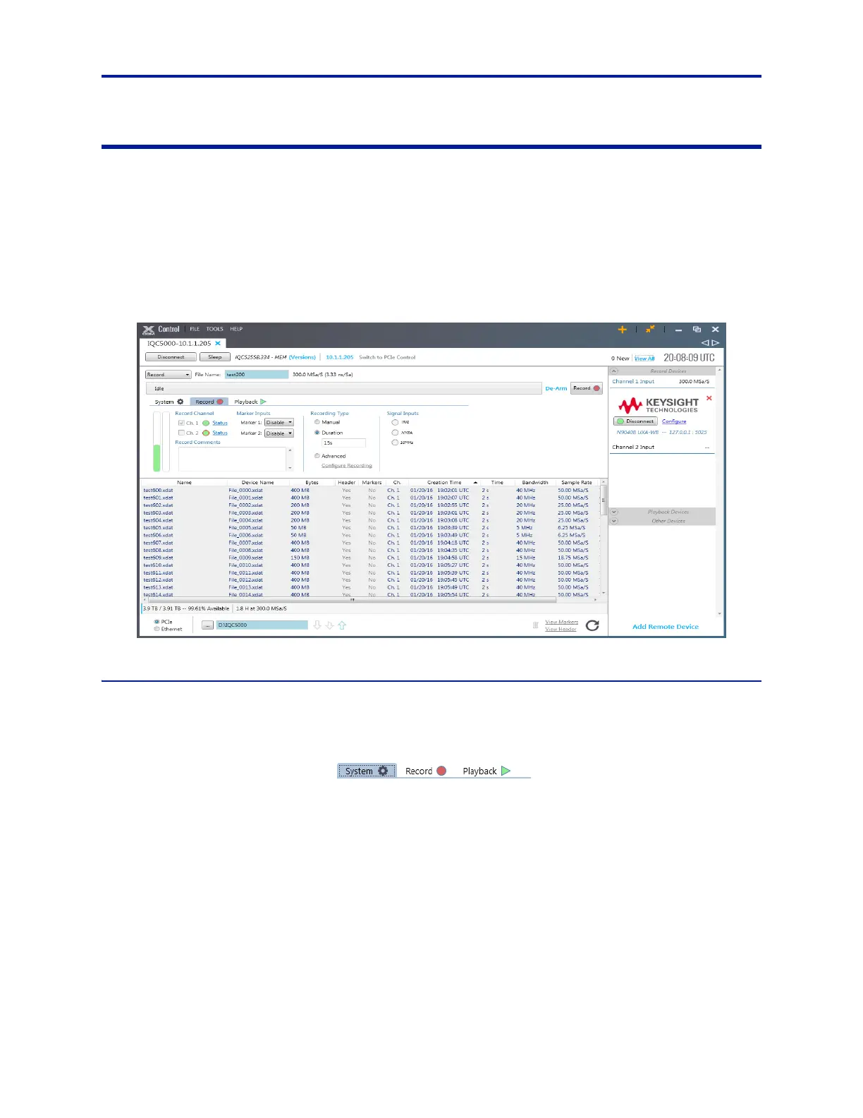 IQC5000 Management – at the top left of the tab, this pane manages recording, playback, marker, and trig-