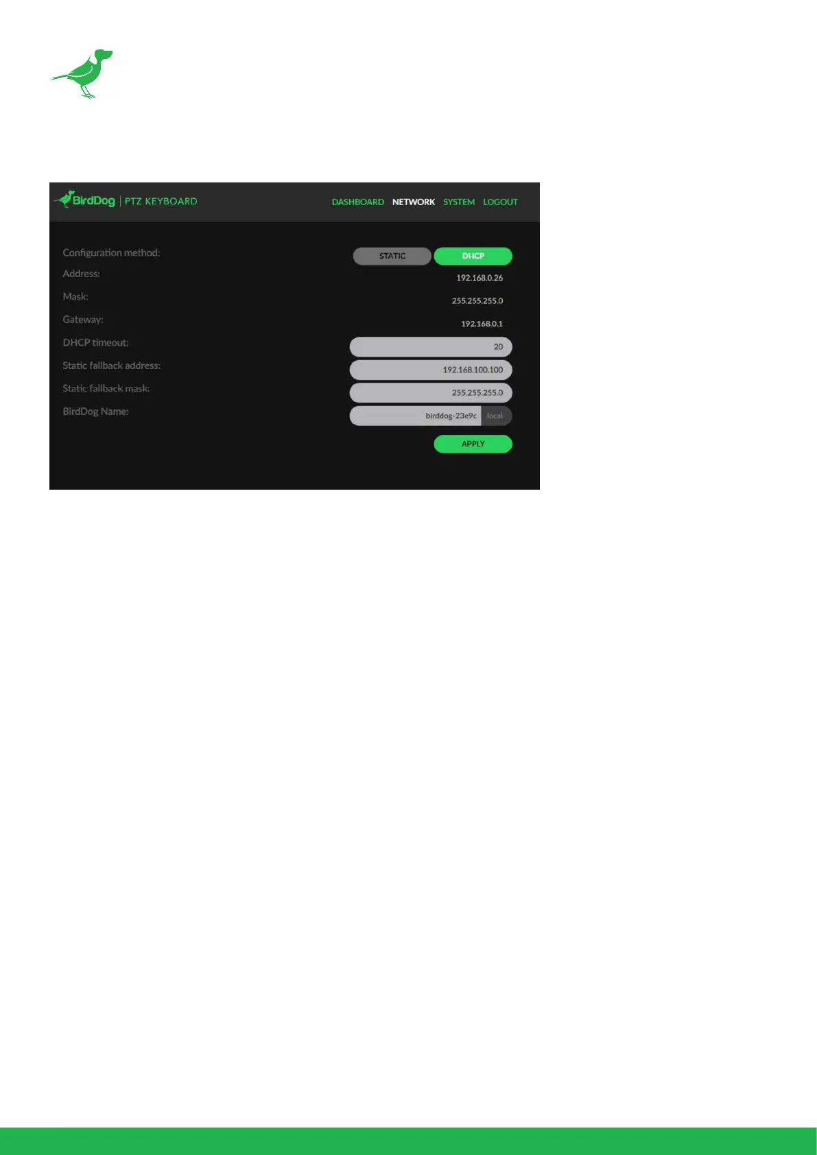 change your computers IP address to match the BirdDog unit. Once you gain access to the BirdDog