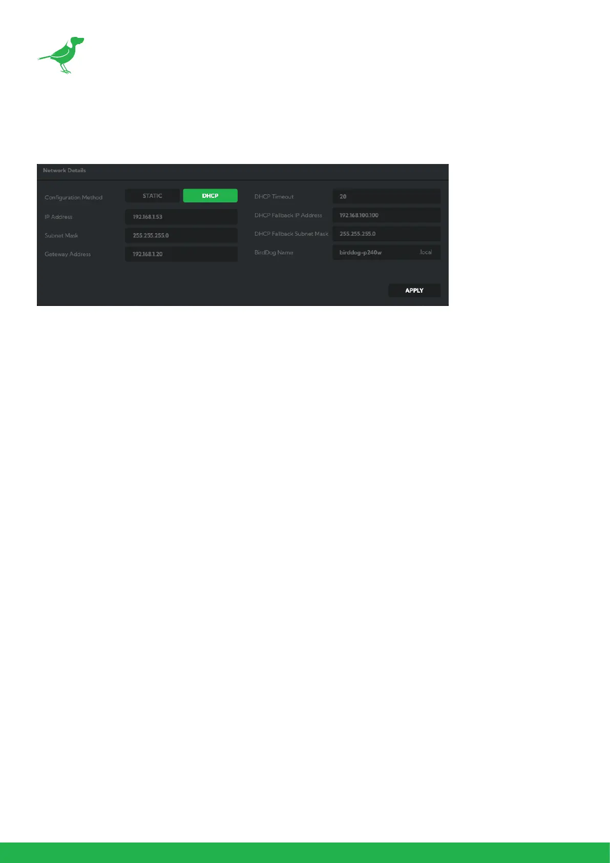 Here you can set the network conguration to either DHCP (default) or Static. DHCP simplies the management of