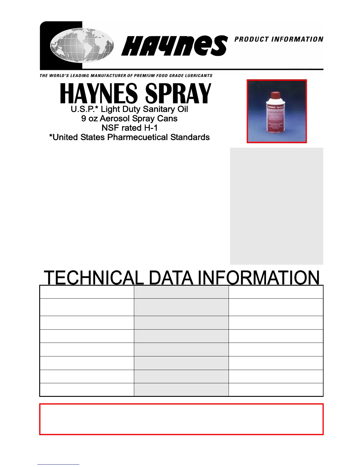 Haynes Spray is a light duty sanitary oil lubricant for all