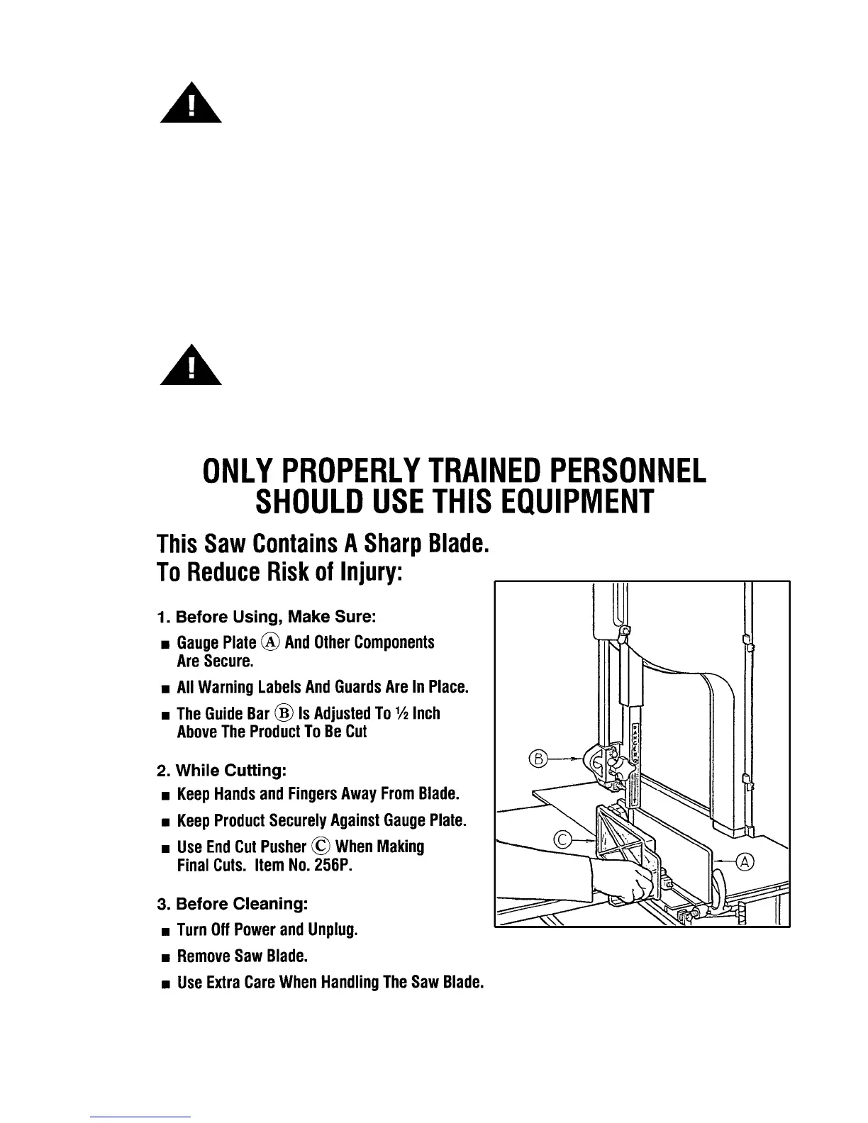 6. ALWAYS use the safety End Cut Pusher Plate (Part No. 256P) for smaller products or the last cuts of