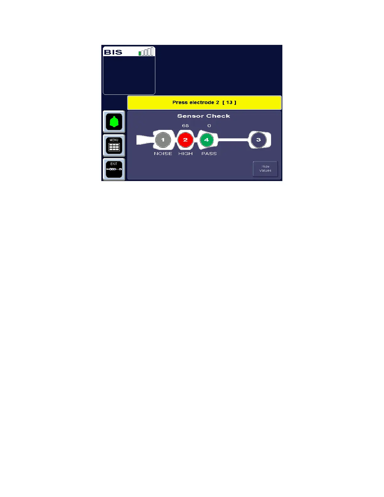 In this display, the impedance value for each electrode, in kilo ohms, appears on the screen