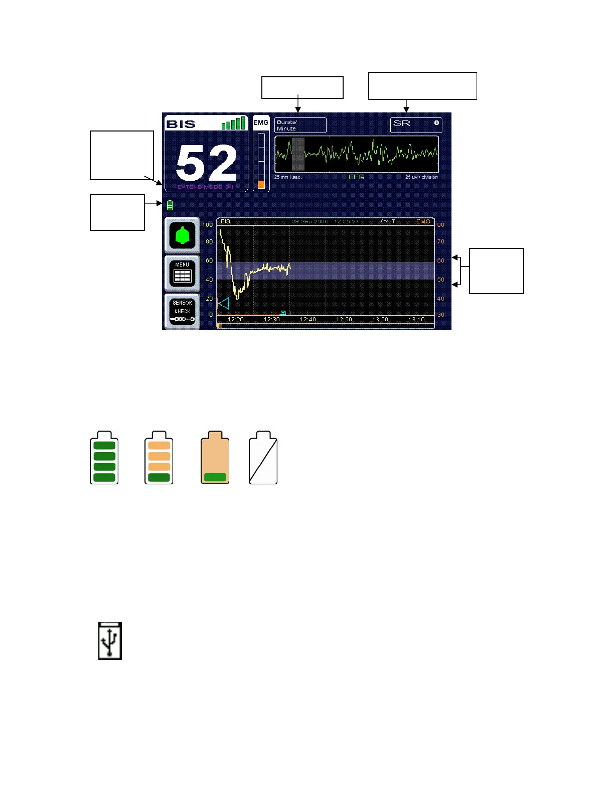Figure 10 - BIS Trend Data Screen with Battery Icon, Target Range, SR, and Burst