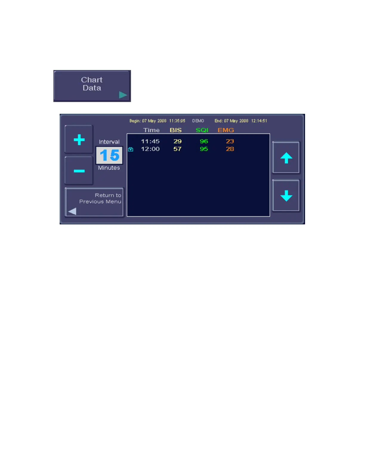 When selected, this option provides a listing of BIS, SQI and EMG values at a selected