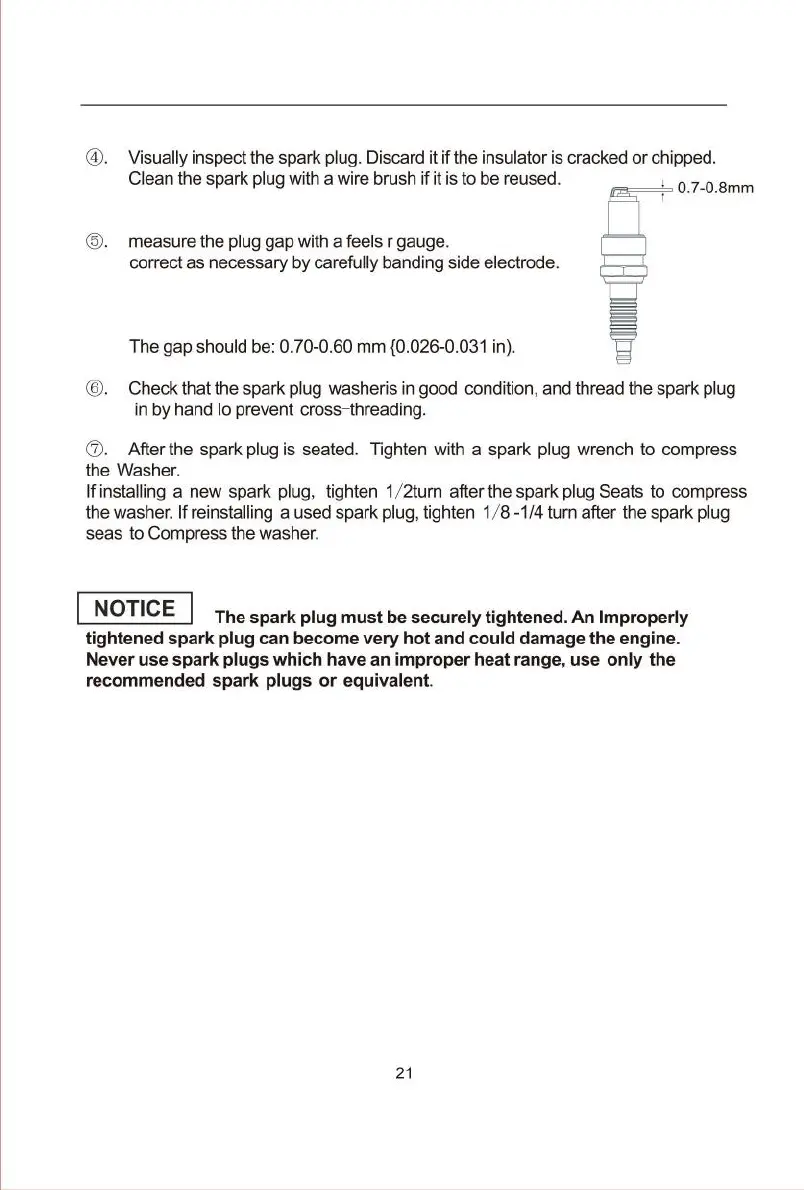 the washer. If reinstalling a used spark plug, tighten 1/ 8 -1/4 turn after the spark plug