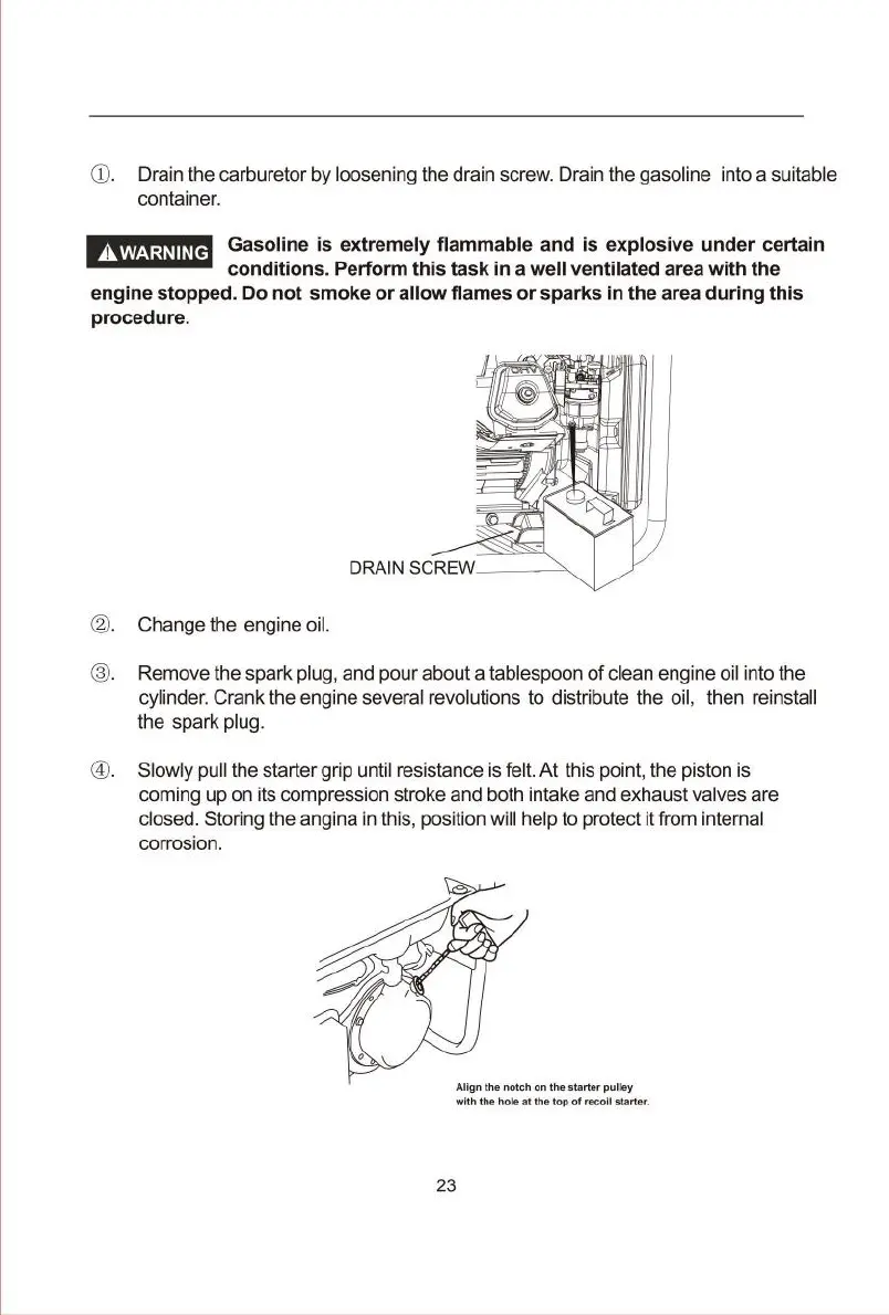 . Drain the carburetor by loosening the drain screw. Drain the gasoline into a suitable