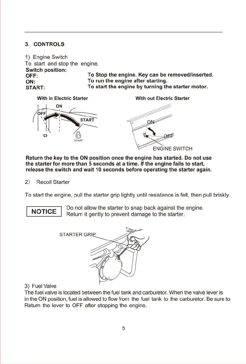 To start the engine, pull the starter grip lightly until resistance is felt, then pull briskly.