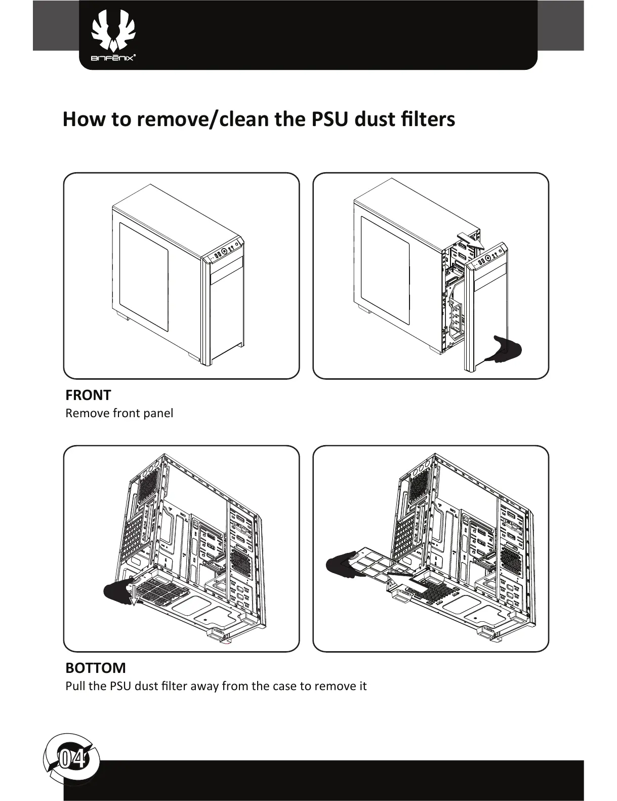 BitFenix NOVA - PSU Dust Filter Maintenance; Front Dust Filter Removal and Cleaning; Bottom Dust Filter Removal and Cleaning