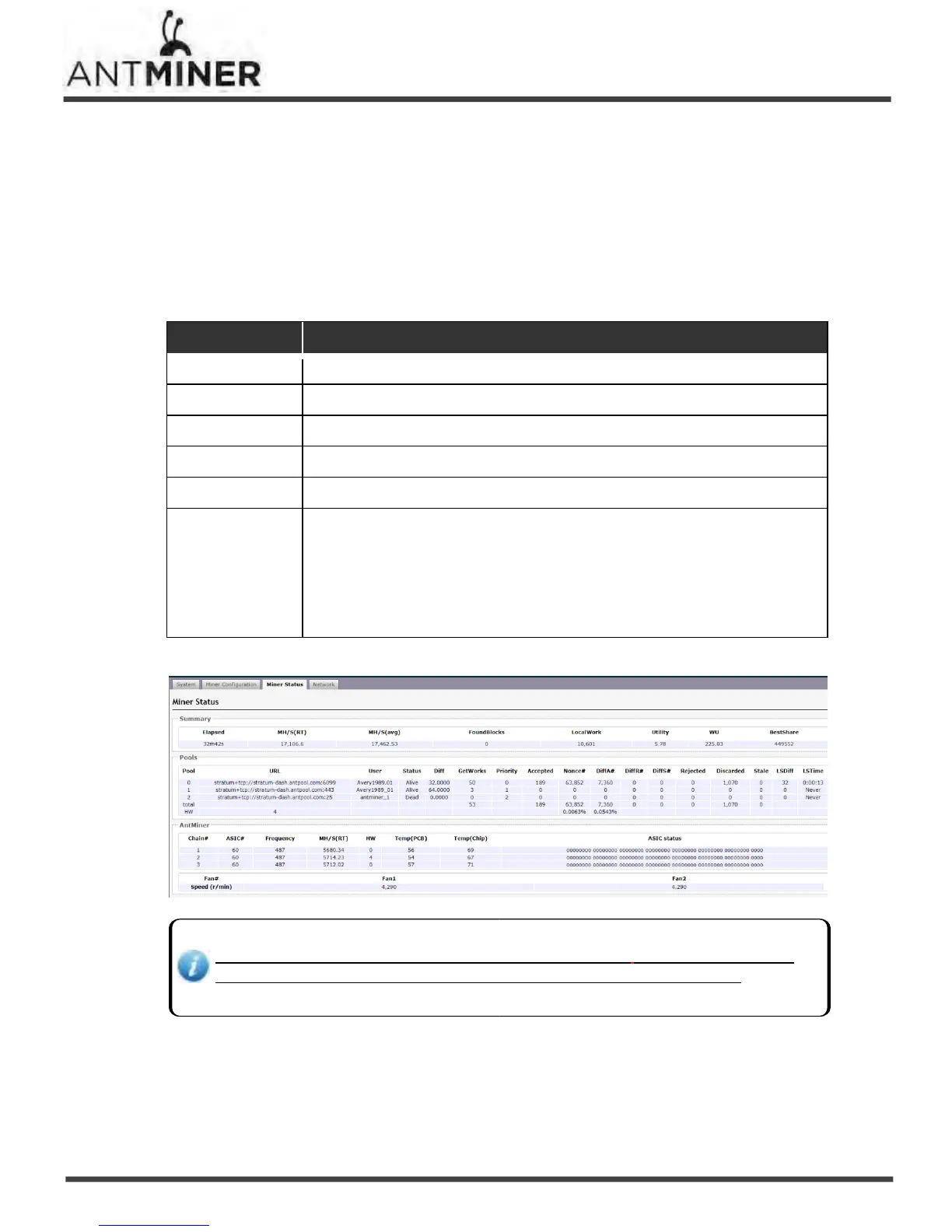 2. Under AntMiner, monitor your miner according to the descriptions in the following table: