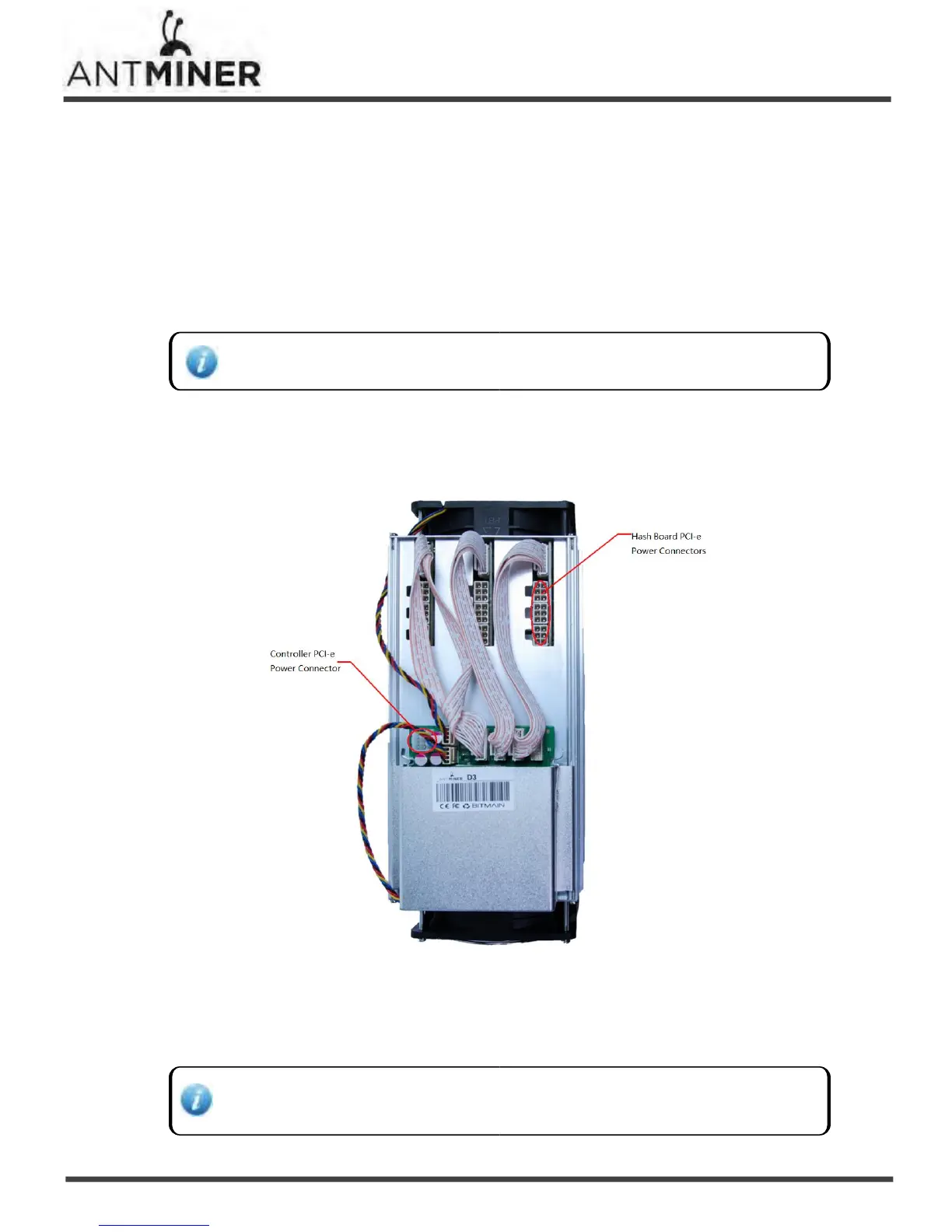 1. Connect PSU power cable connectors to each of the nine PCI-e connectors on the top of the AntMiner D3,