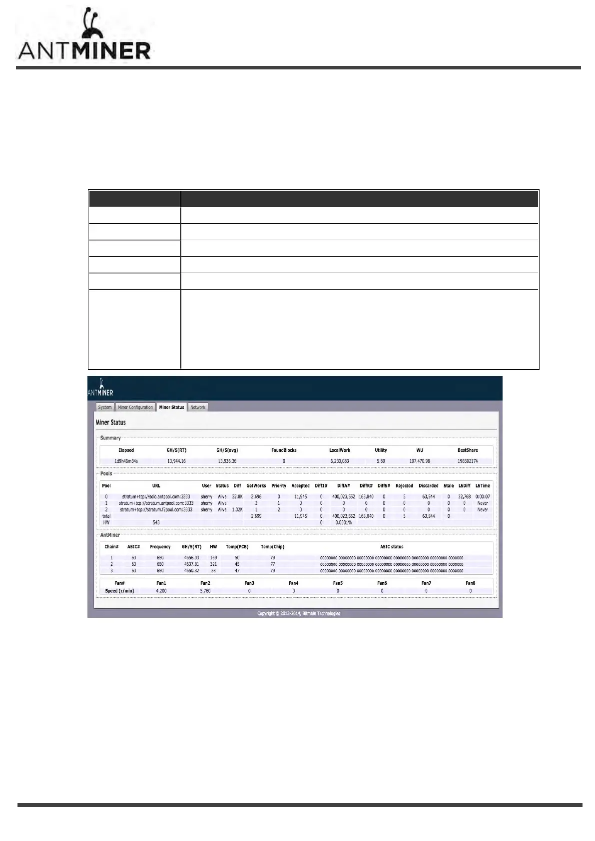 2. Under AntMiner, monitor your miner according to the descriptions in the following table: