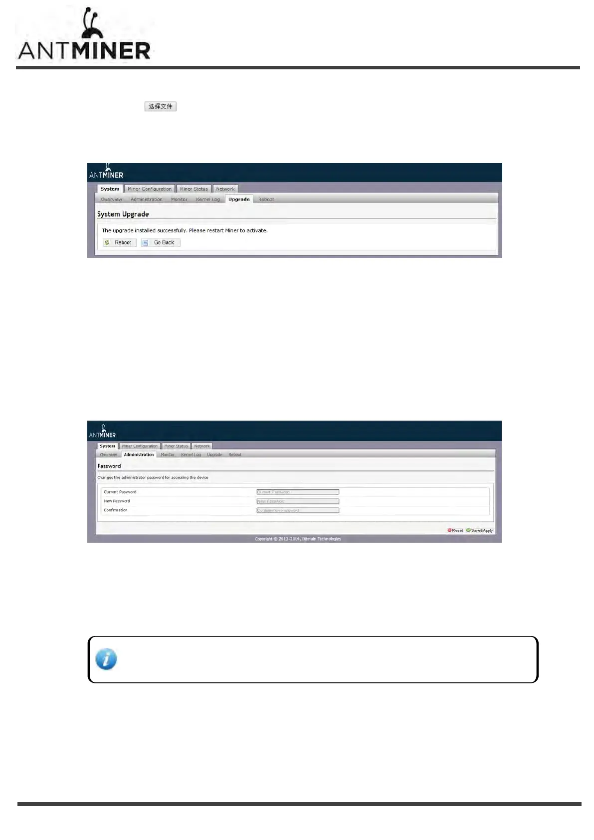 ■ Reboot - to restart the miner with the new firmware.