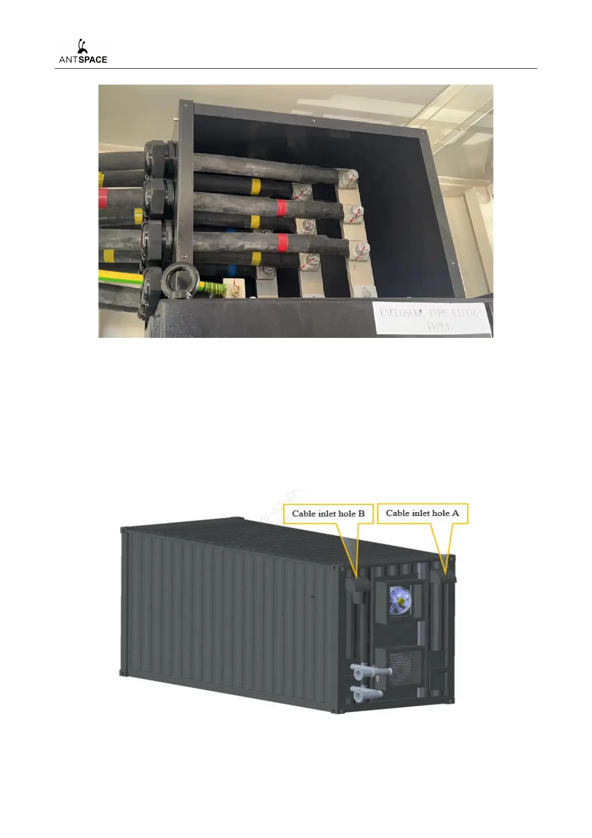 The cables are connected from the upper two openings on one side of the container exhaust fan,