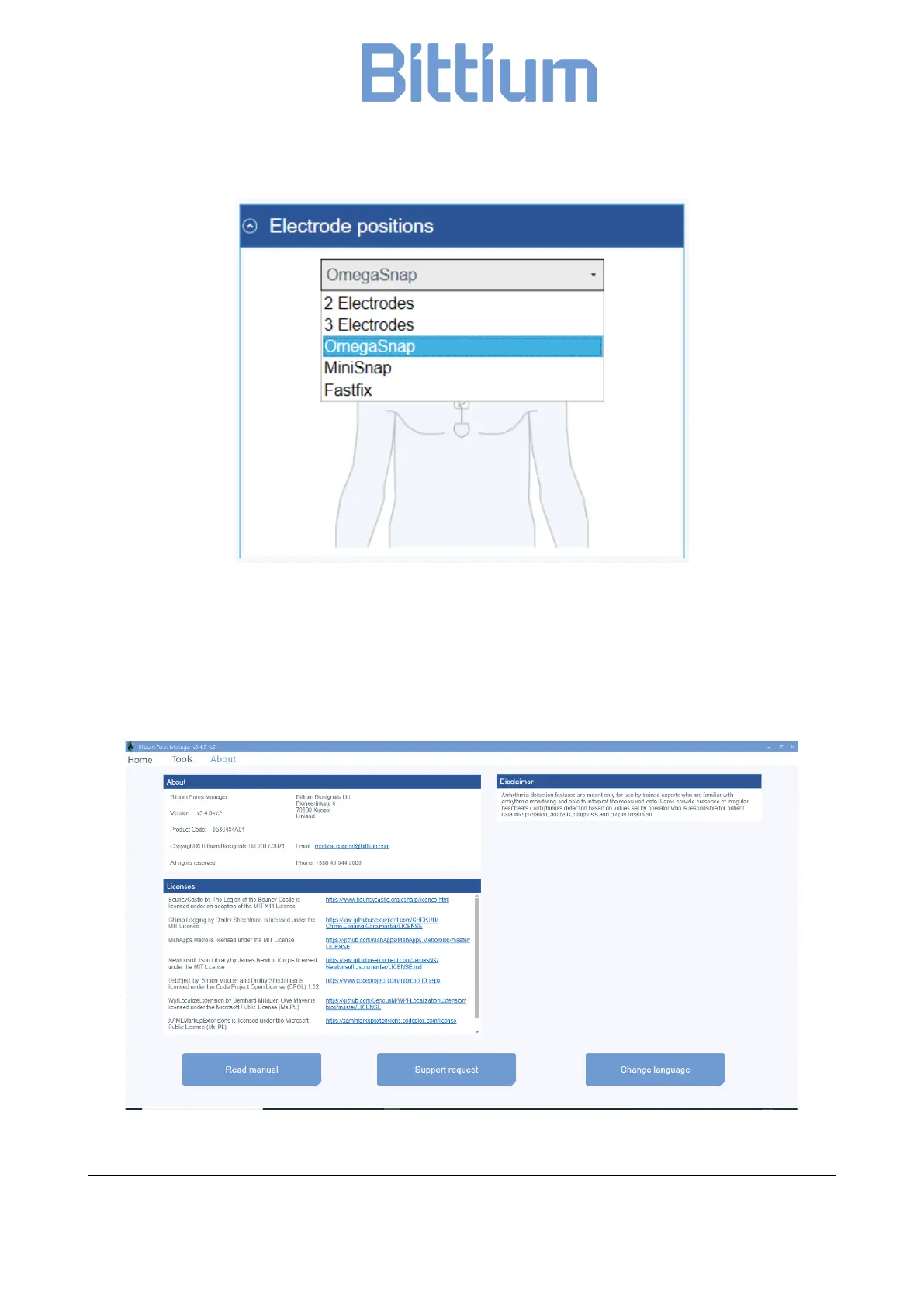User Manual by clicking ’Read Manual’ and send a support request to Bittium Biosignals by clicking ’Support