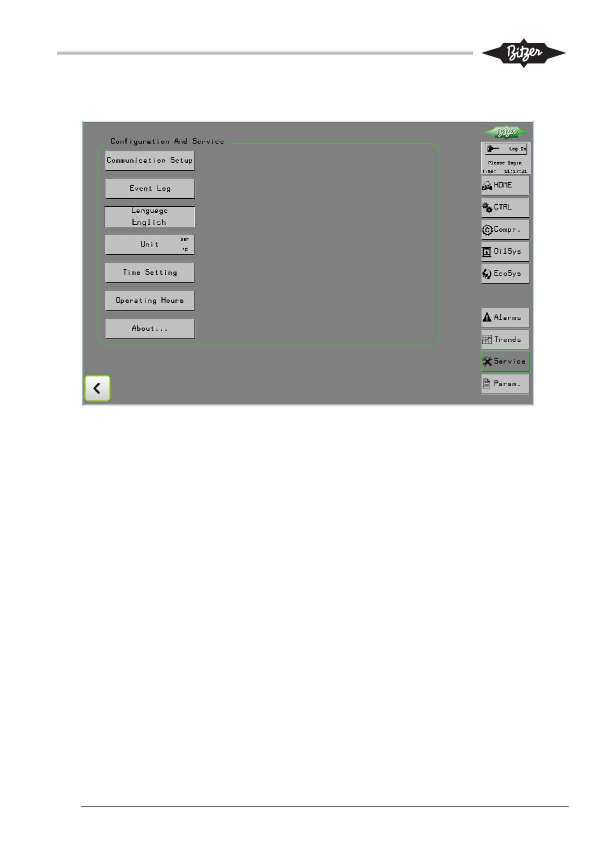 The Service screen gives access to several functions, primarily related to configuration and service.
