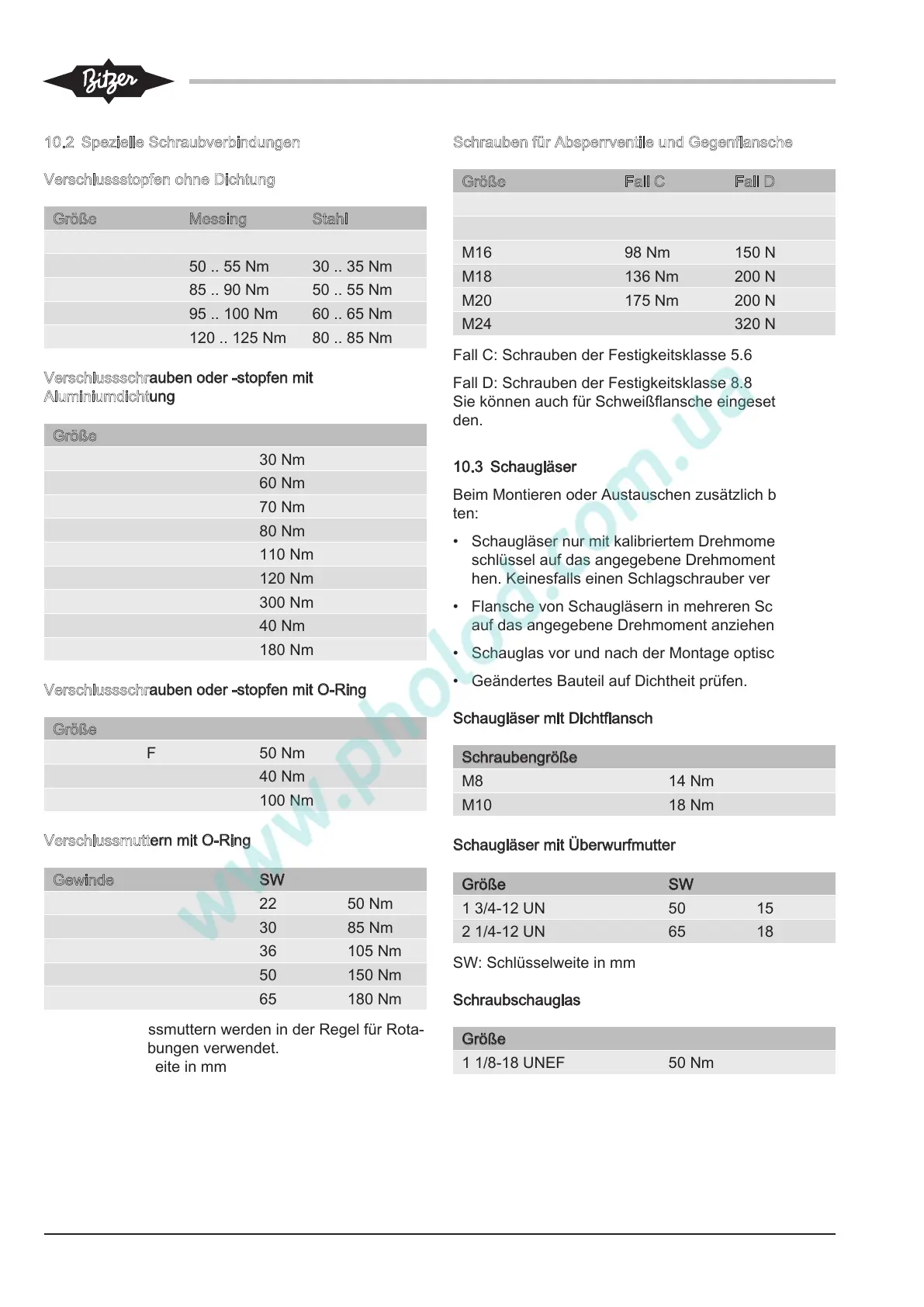 • Schaugläser nur mit kalibriertem Drehmoment-