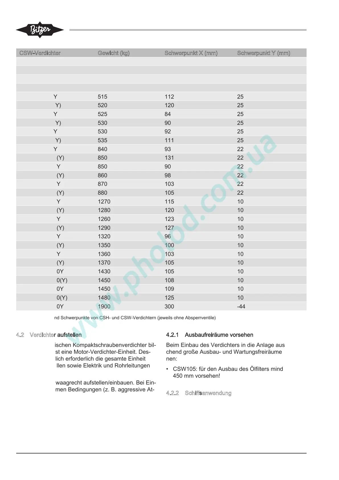 CSW-Verdichter Gewicht (kg) Schwerpunkt X (mm) Schwerpunkt Y (mm)