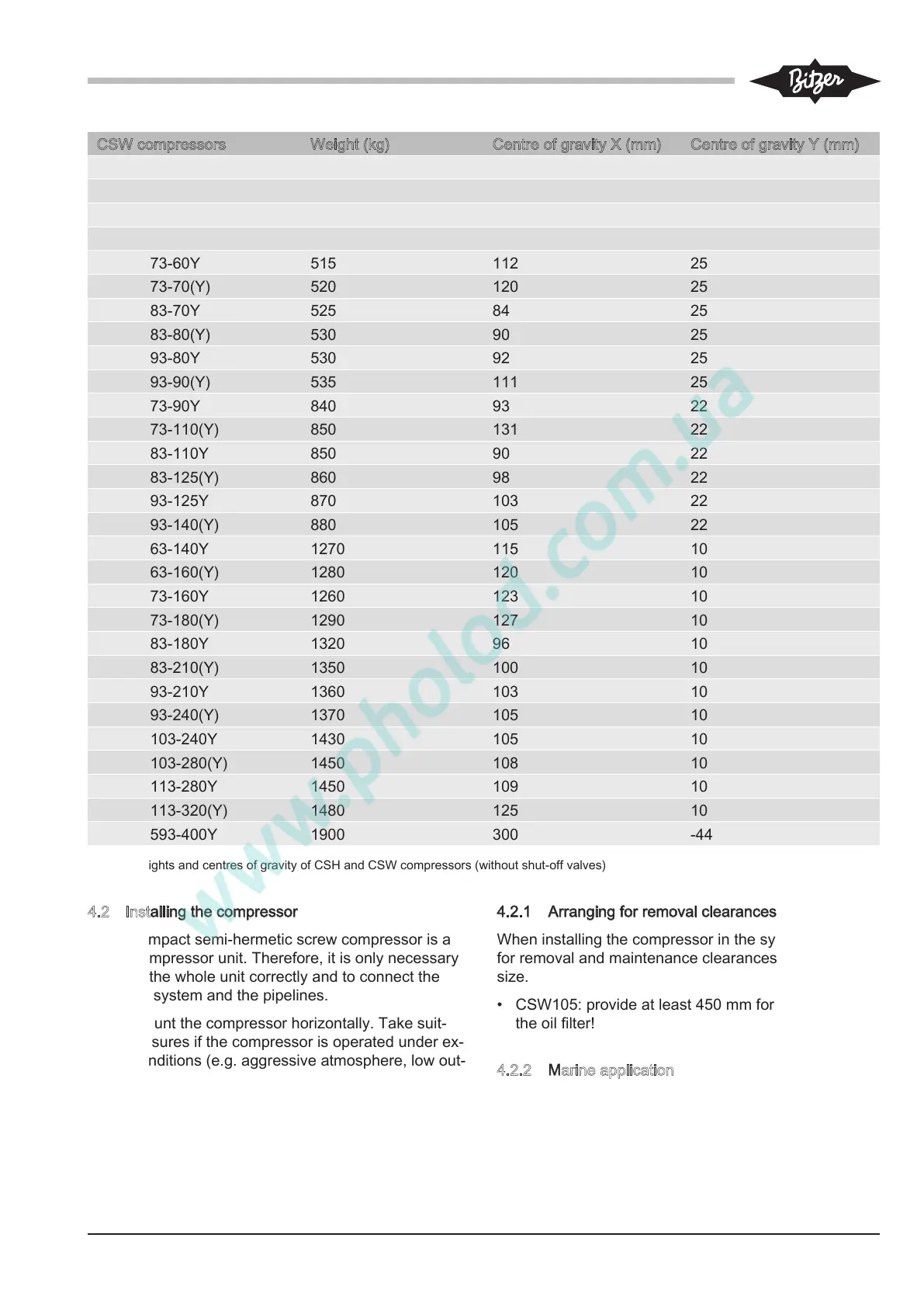 CSW compressors Weight (kg) Centre of gravity X (mm) Centre of gravity Y (mm)