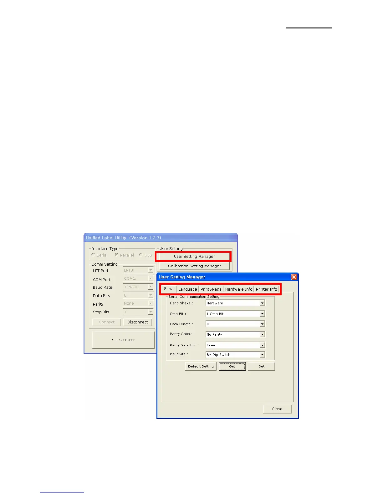 Handshake, Stop Bit, Data Bit, Parity, Baud Rate, etc. can be set.