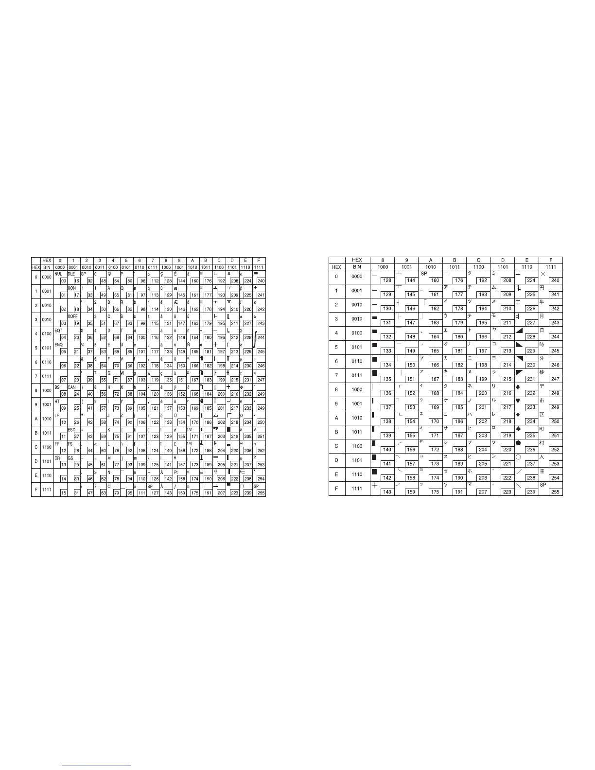 The following pages show the character code tables. To find the character