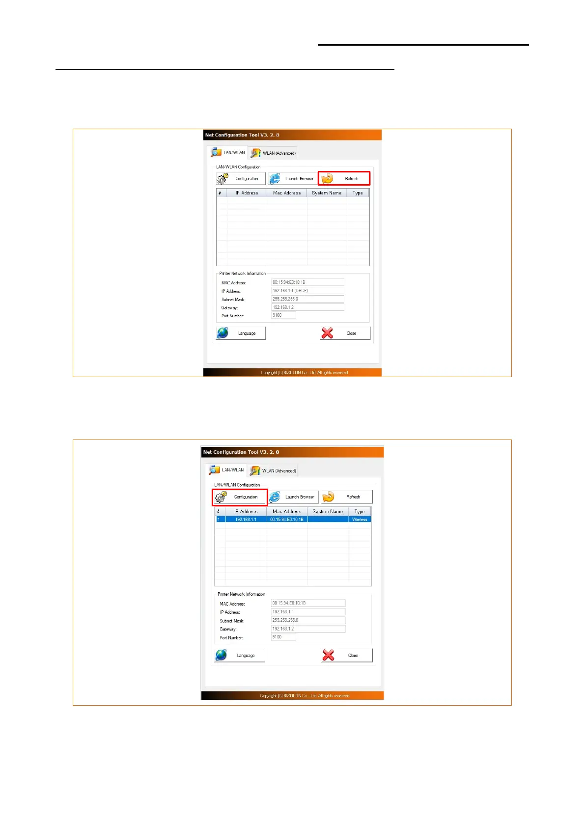 1) When you press the Search button, the printer connected to the network will be shown