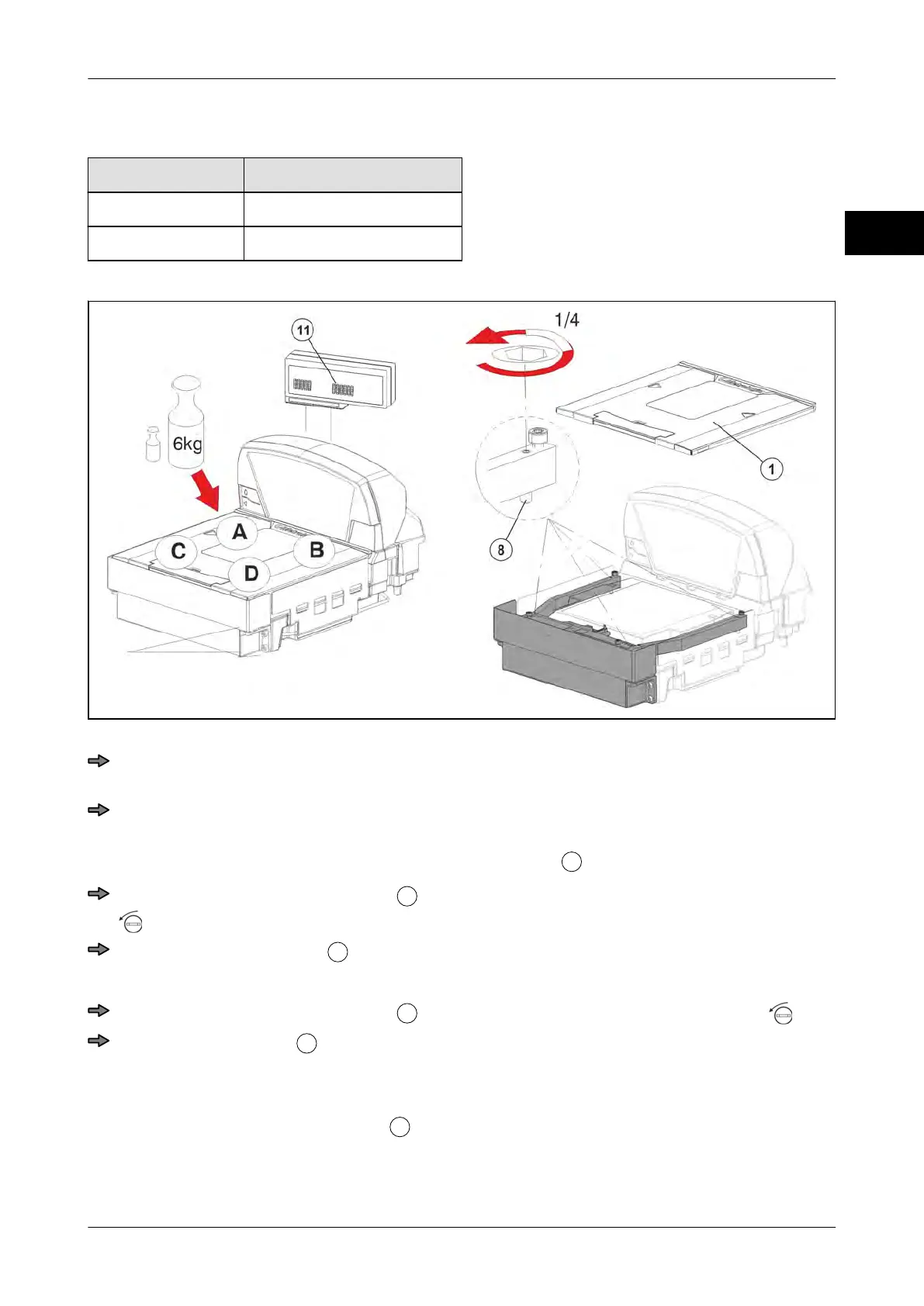 Put the max. load plus 1/30 of the max. load (e.g. 6 kg + 200 g or 15 kg + 500 g) in