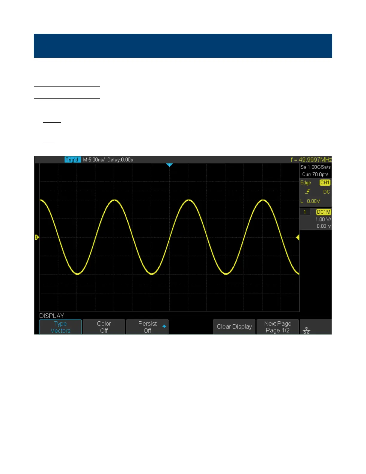 Press the Display key on the front panel, then press the Type softkey to select Vectors or Dots display type.
