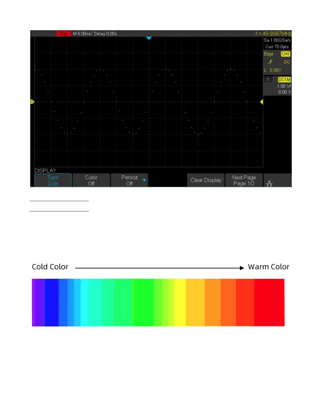 The picture below shows the change of color from cold to warm. Press the Display key on the front panel, and then press
