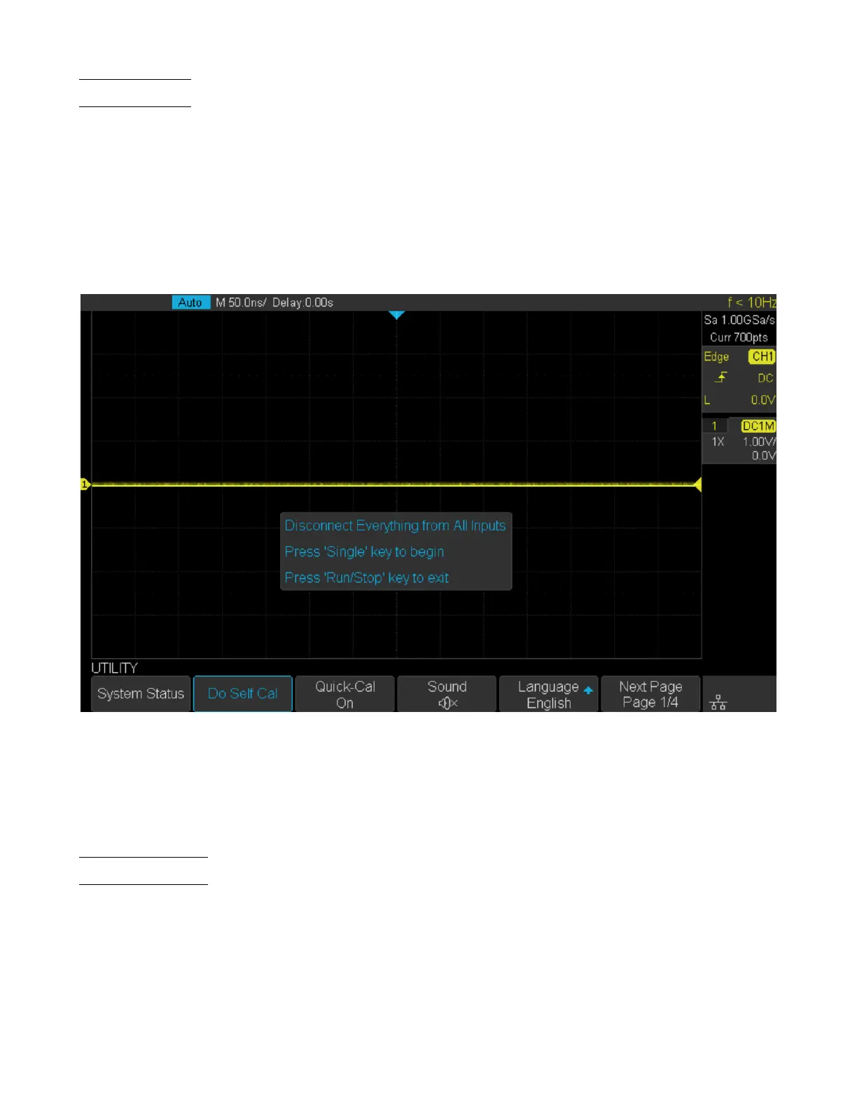 2. Press the Utility key on the front panel, and then press the Do Self Cal softkey, and the oscilloscope will pop-out