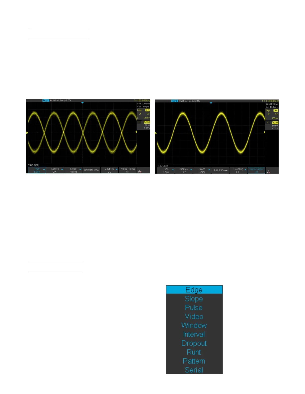 • Remove the noise from the rtigger path setting Trigger coupling to LF Reject, HF Reject, or enabling Noise Reject.