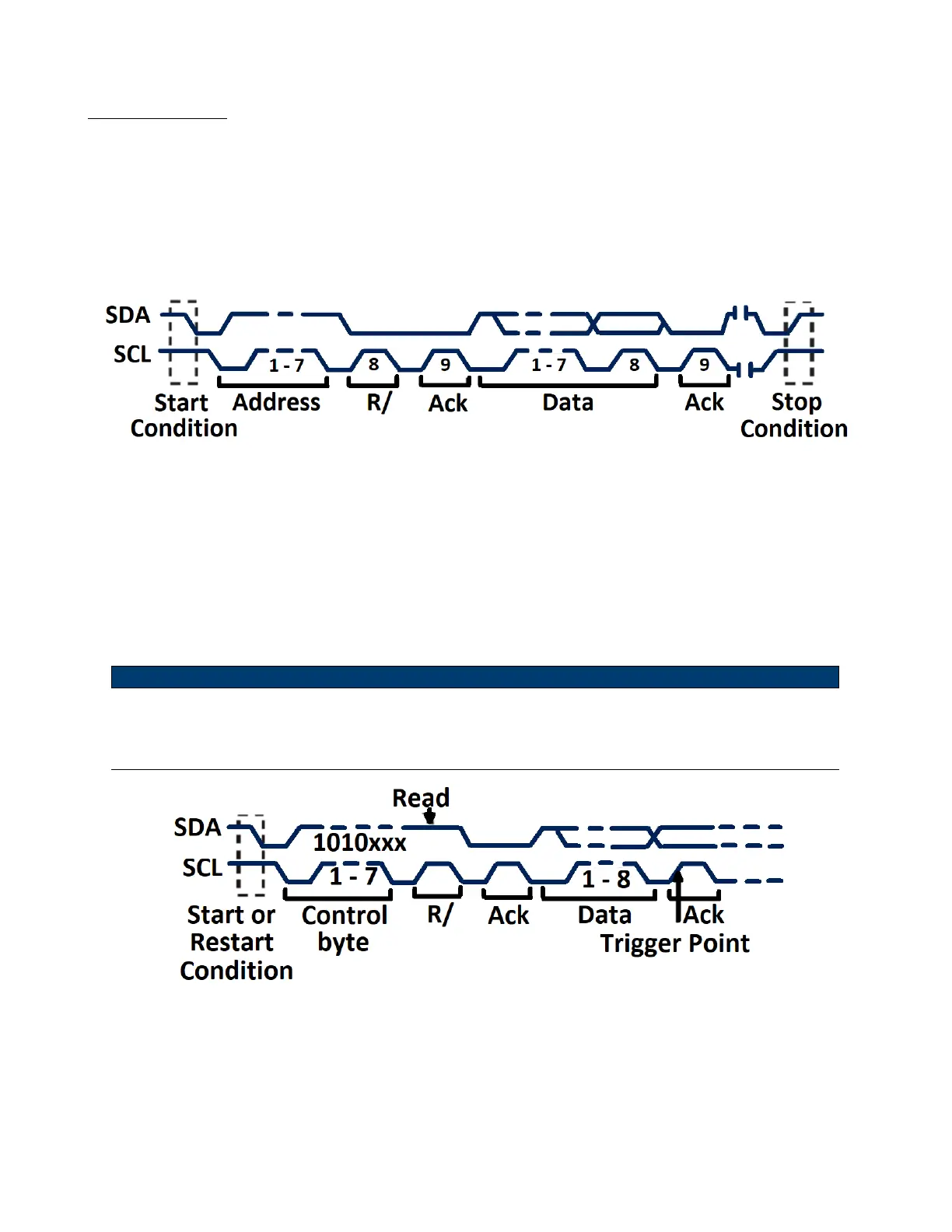 • Start Condition: The oscilloscope will be triggered when the SDA signal transitions from high to low while the SCL